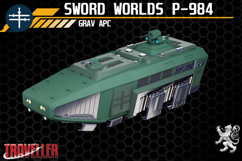 The 20 ton Sword Worlder P-984 APC is an armoured personnel carrier. It has been in service since the late 900s in the Traveller universe and the design has been updated on several occasions but the basic configuration has not been altered. It is often used as a transport for exploration and survey teams, and in similar nonmilitary applications. This version has room for 12 persons. As a grav combat vehicles, the P-984 is armoured with a light autocannon and a anti-missile minigun. The P-984 also comes in 1:270 scale and as a tactical miniature.