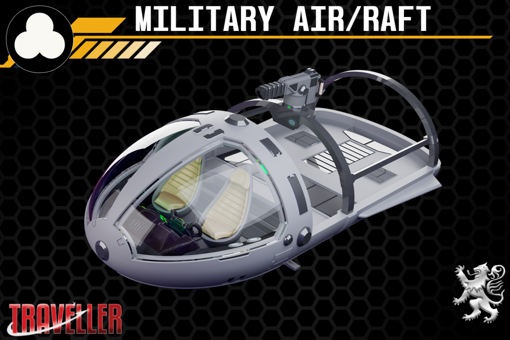 The 6.5 Tons Military Air Raft, used by the Zhodani Military, is an open-topped light grav vehicle for patrol and security work.