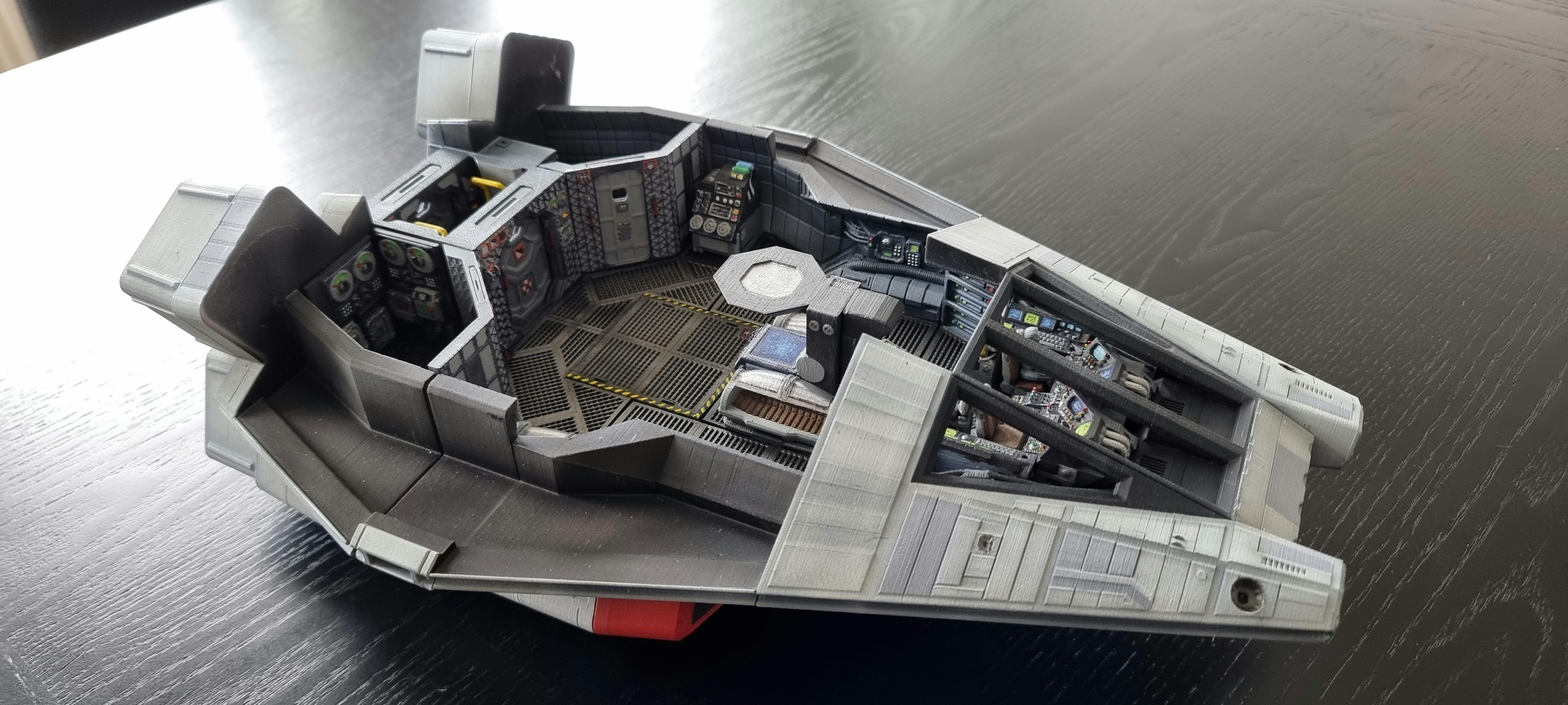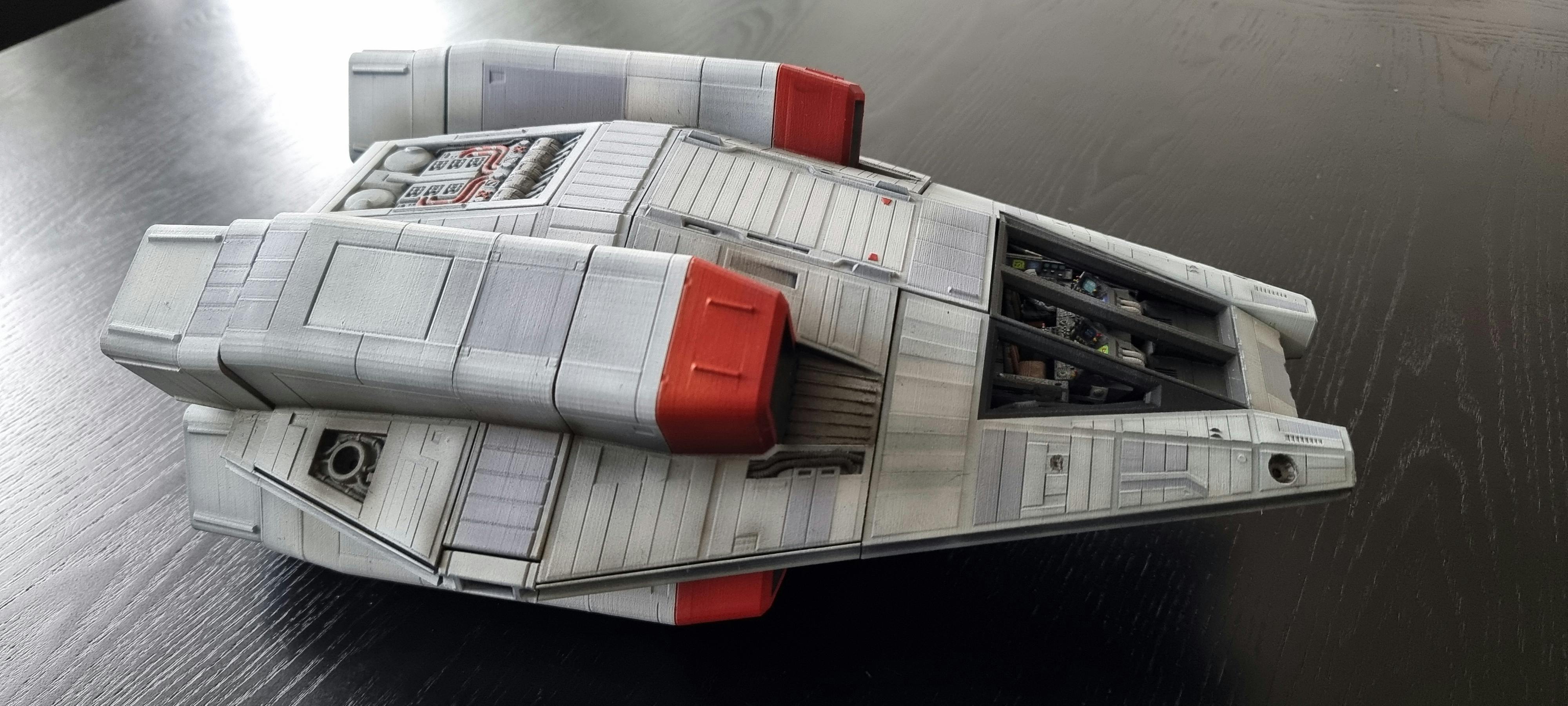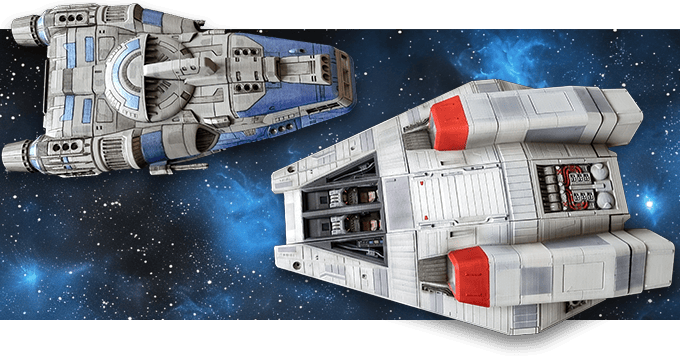 In the campaign we offered a shuttle, the Erebus, in the design language used by the great Ron Cobb. This 3D printable ship has been designed with playability in mind and is an optimal build size at around 13 inches in length. We offered both pre-printed physical ships for the connoisseur with too little time to print, and, as usual, the STL files to print yourself.